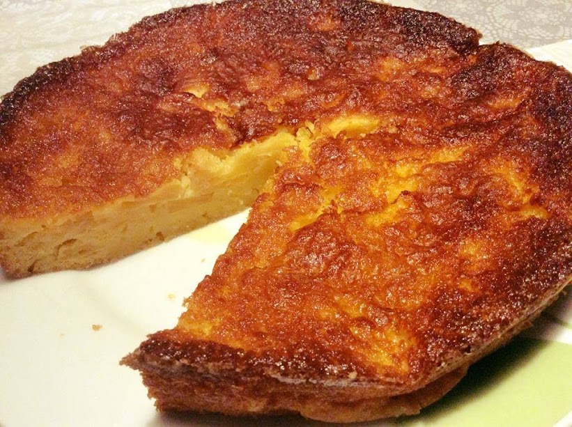 4.Sortir le gâteau du four. Verser dessus la crème obtenue avec le beurre fondu, le sucre et l'oeuf. Remettre au four 25 minutes, même température.